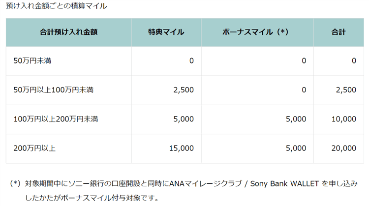 - 条件:ソニー銀行の口座開設と同時にANAマイレージクラブ / Sony Bank WALLET申込み