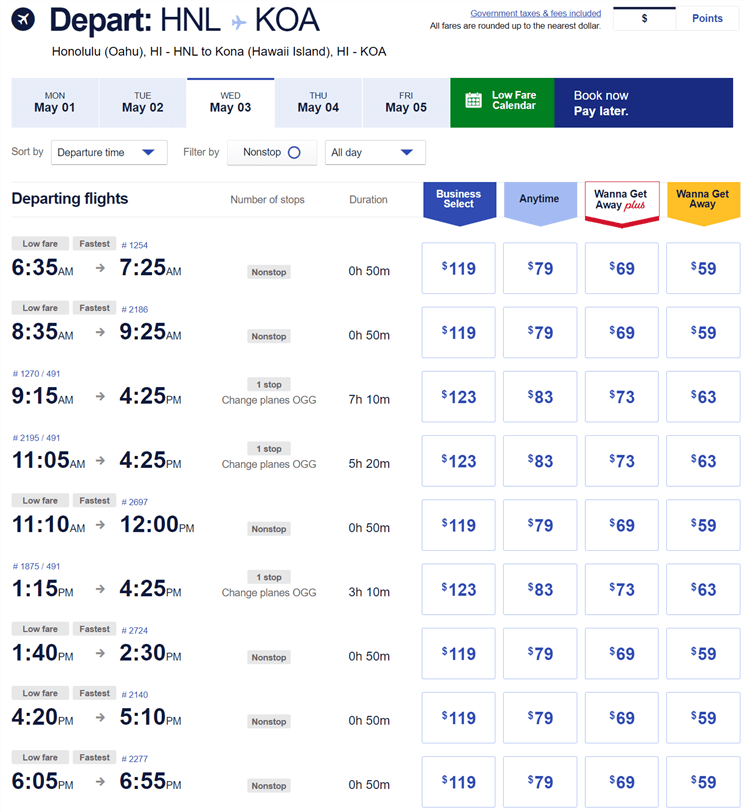 こちらがホノルルからコナ行きの運航スケジュールになります。(2023年5月のケース)