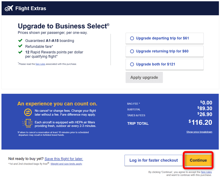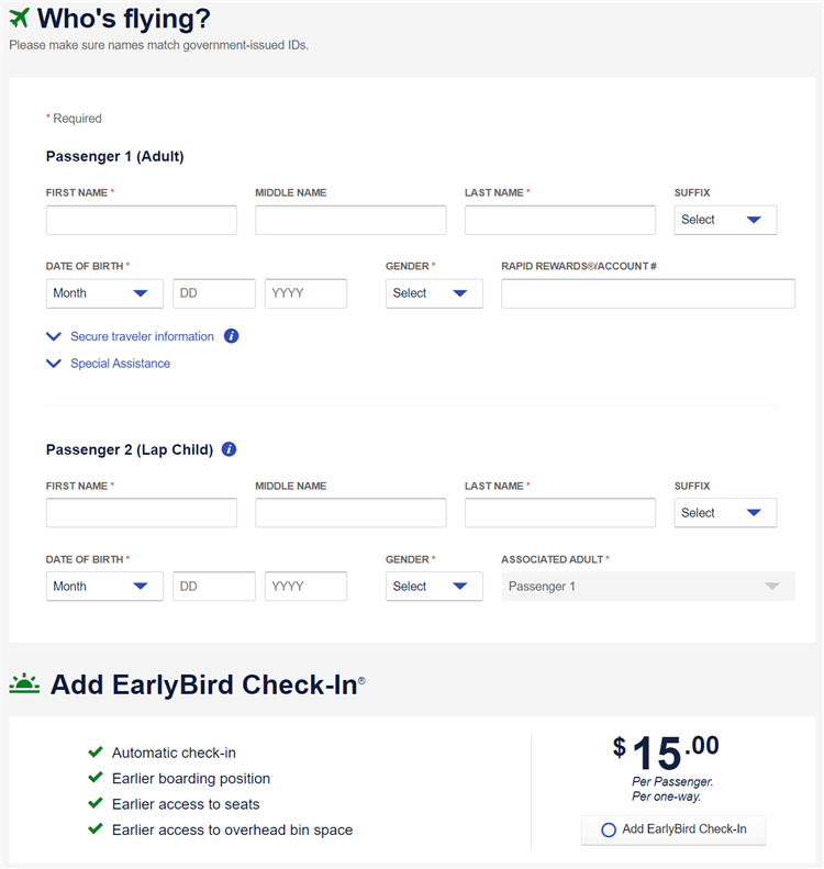 また途中に「Add EarlyBird Check-In®」のアップチャージの有無があります。