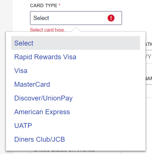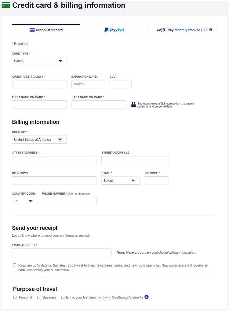 サウスウエスト航空の支払いはクレジットカードもしくはPayPalの選択が出来るようになっています。