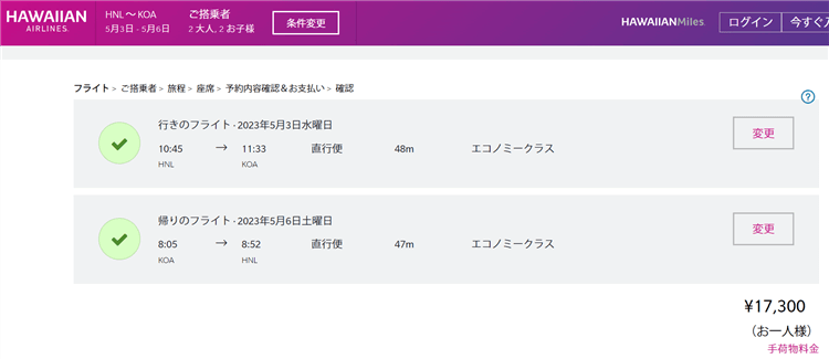 まずはハワイアン航空ですが、ホノルル-コナの往復だと17,300円となります。