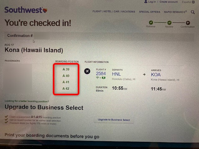 サウスウエスト航空は前日に事前チェックインが出来るようになっているのですが、その事前チェックインで搭乗の際の順番が確定します。