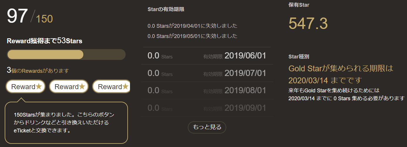 最初に集められるStarはGreen Starです。1年以内にGreen Starを250Stars集めると、そこから新たにGold Starが集められるようになります。Reward eTicket