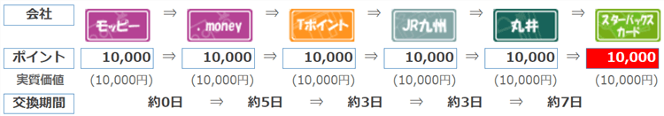 なのでちょっと手間がかかりますが上記のようなルートで等価交換でスターバックスにポイントを移行していくことができますよ!