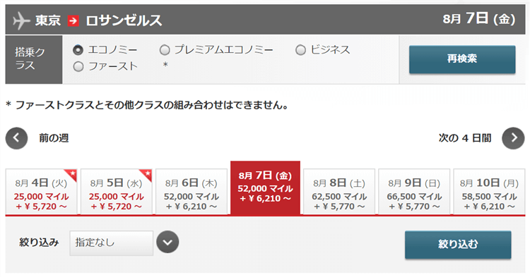 更に前日の8月5日であれば必要マイル数も半分以下となり、30,000JALマイル、17,900円の差額調整となります。
