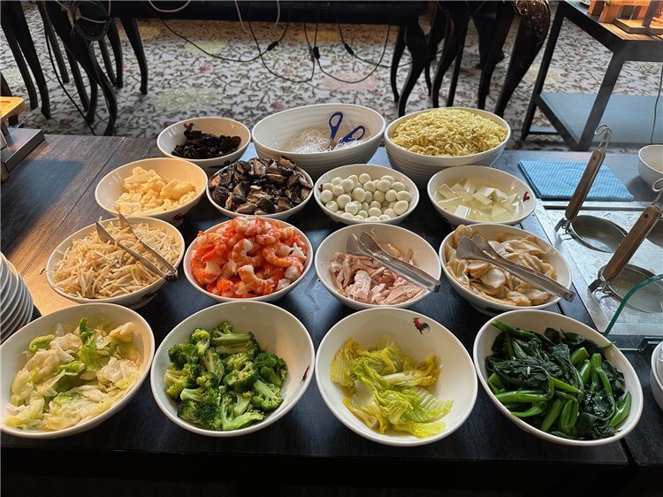中央に四角くテーブルを置いており、回遊が出来るようになっているブッフェ朝食です。