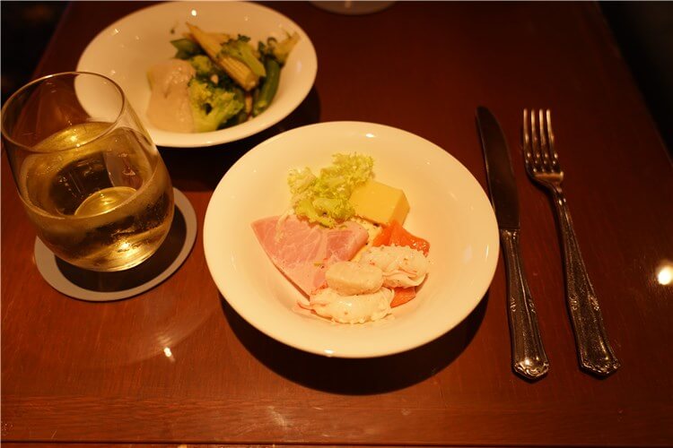 私はというとスパークリングにハム類とチーズ、野菜などを頂きました。