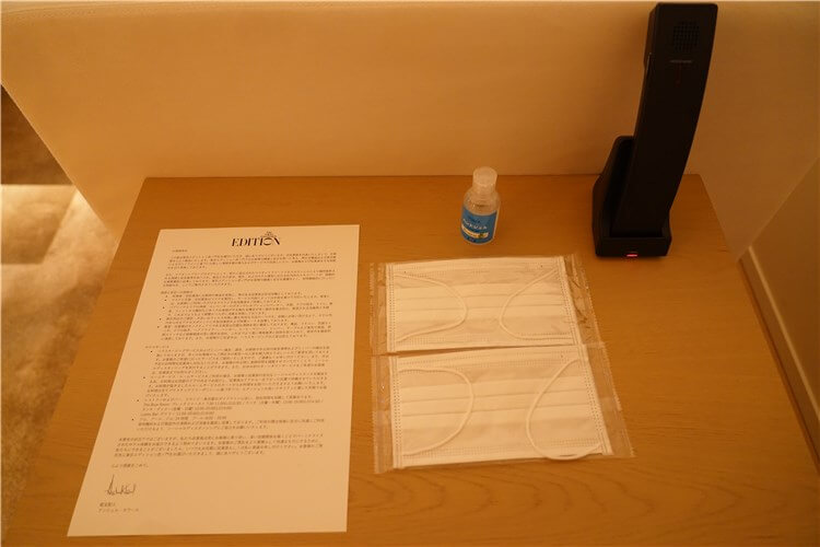 ソファ手前にはサイドテーブルがあり、エディションの案内、消毒液、マスクが2つと電話がありました。