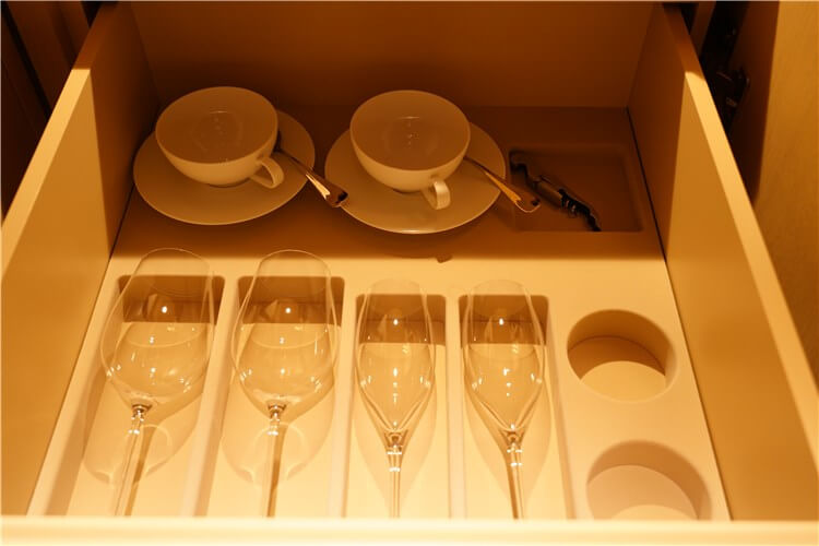ミニバーの下にはチェストがあり、引き出しを開けていくとグラスとカップ。