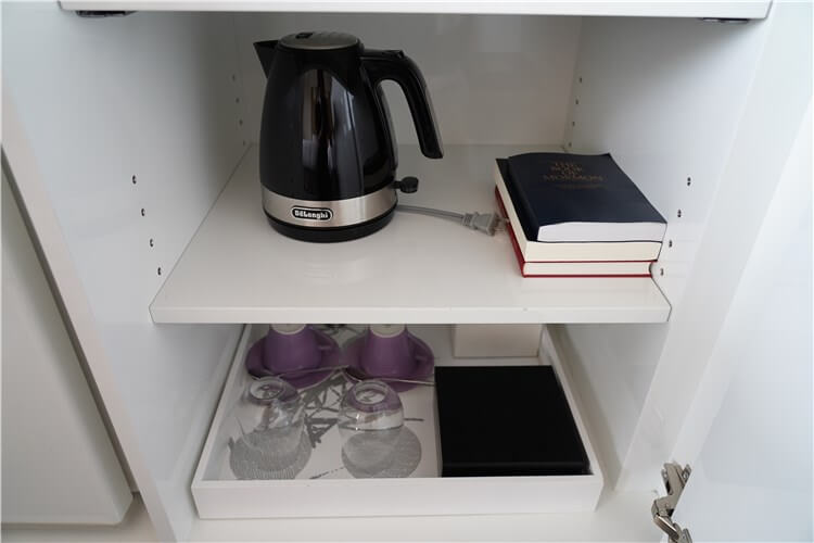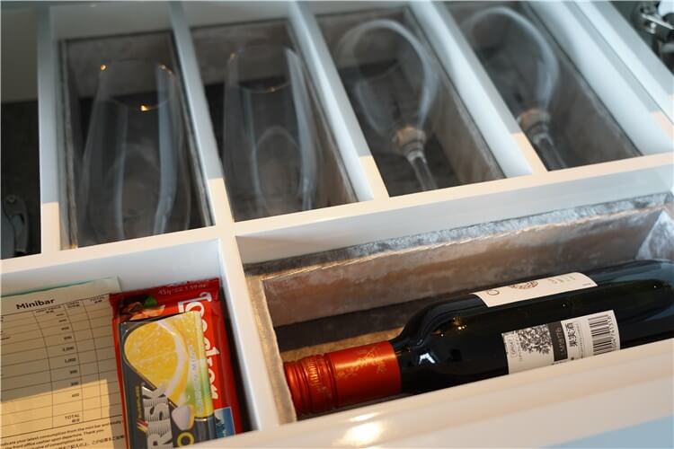 引出しにはアルコール用のグラス類、赤ワイン、お菓子があります。