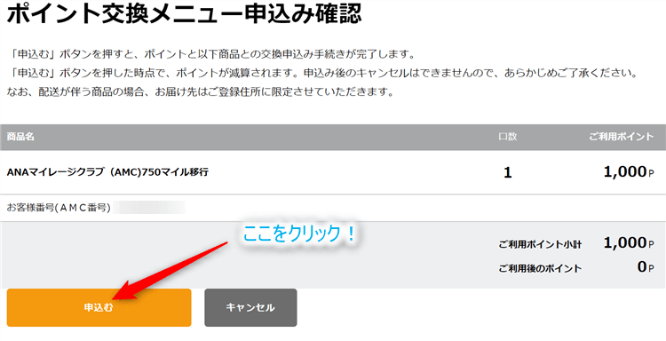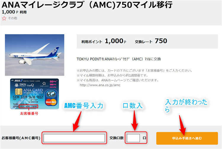 こちらにAMC番号を入力し、交換口数(1口1,000ポイント)を記入したら「申込手続きへ進む」をクリックしてください。