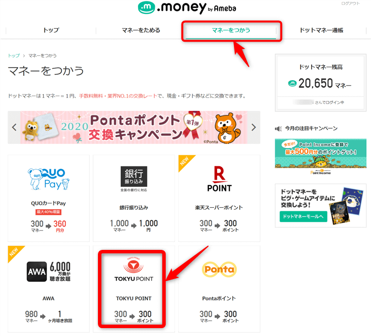 1.ドットマネーからTOKYUポイントにポイントを交換しましょう