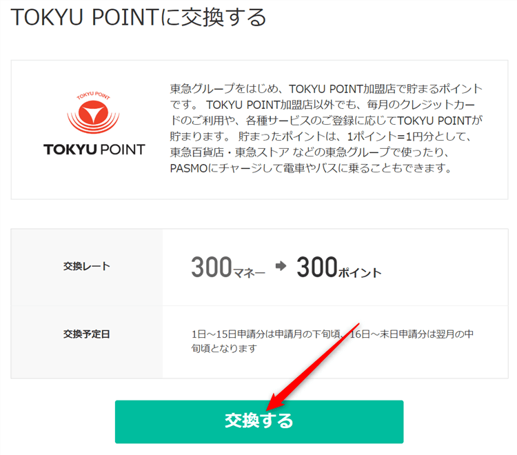 月間交換上限は100,000マネー(100,000TOKYUポイント)までとなります。