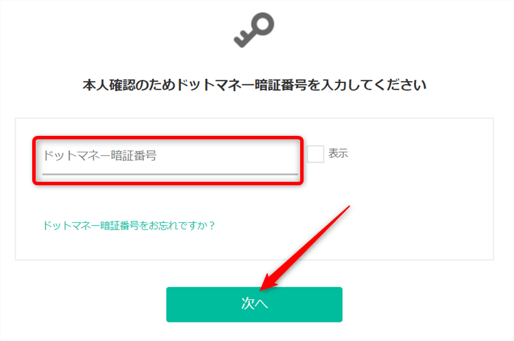 次にドットマネーの暗証番号を入れて、「次へ」をクリックしてください。