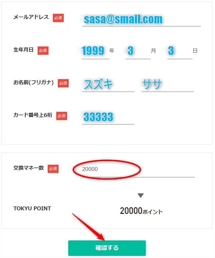 後は交換したいポイント数を記入して、「確認する」をクリックすれば交換完了となります。