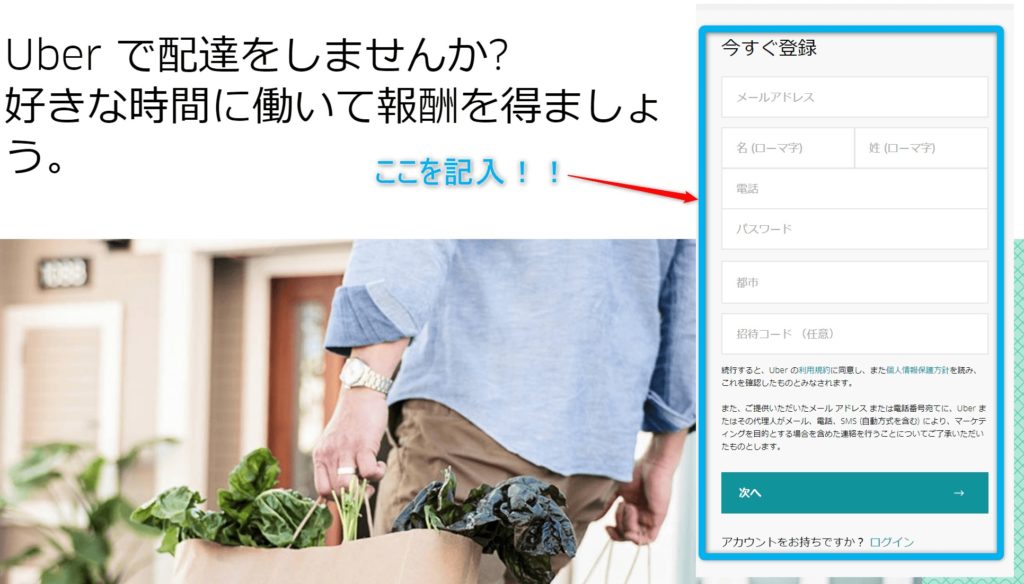 3.Uber Eats(ウーバーイーツ) 申し込みページに入る
