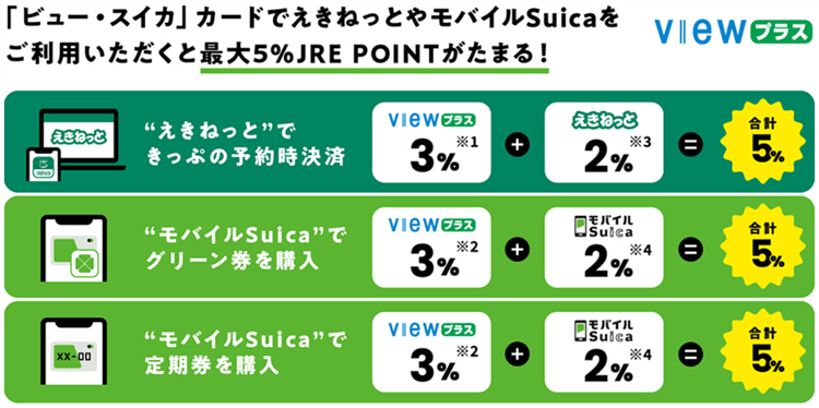 「えきねっと」でのきっぷ等の購入(予約時決済)にビューカードをご利用いただくと「VIEWプラス」のポイントに加えて「えきねっと」のご利用によるJRE POINTも貯まります!