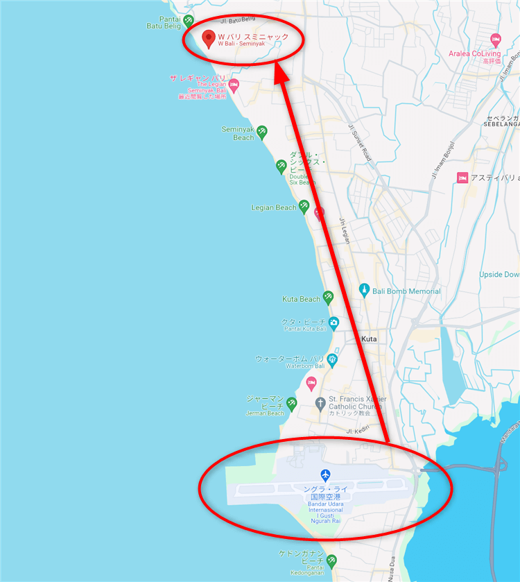 W バリ スミニャックの行き方(住所)、アクセス方法。空港タクシーで30分前後!夕方の渋滞時は1時間前後かかる!