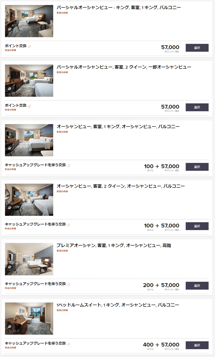 私が予約したときのポイント泊は1種類のルームしか選べないようになっていましたが、現在だとアップチャージで複数のルームが選べるようになっていますよ!