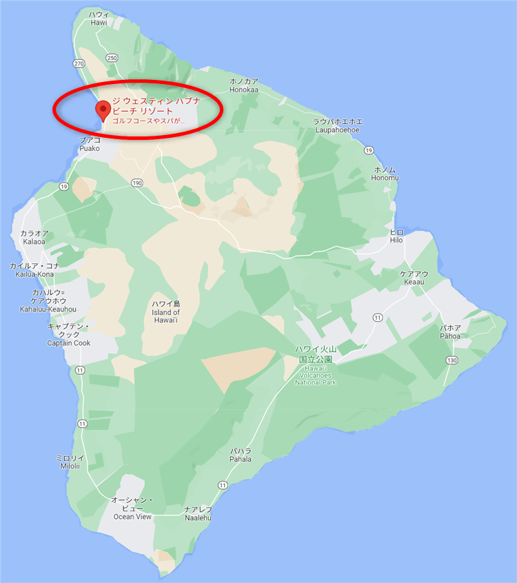 そしてこちらのウェスティンハプナビーチリゾートですがハワイ島の中でも北西側にありますよ!